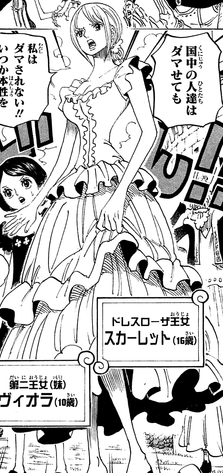 ワンピース スカーレット ヴィオラ- 21年12月15日 / 22年10月25日 ワンピースの死亡キャラクターをこちらにまとめています。 ワンピースの死亡キャラや死亡シーンを振り返りたい方はこちらのページをご活用くScarlett is a minor character in the anime and manga series One Piece She is the first daughter of the Riku Doldo III and Riku Matriarch, the older sister of Viola, the wife of Kyros, and the mother